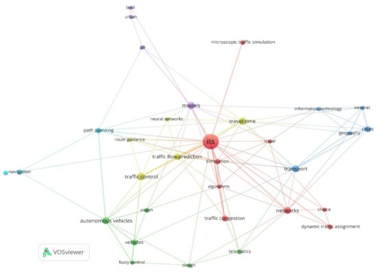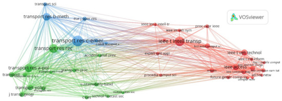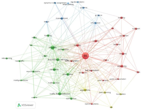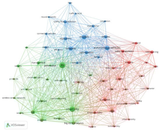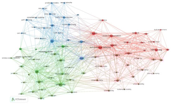 During this period (2016–2019), as depicted in Figure 10 below, the number of research terminologies increased significantly, and became closely linked. Unlike in the previous period, the terminologies were clustered in three distinct categories depicted in red, blue and green. The red cluster encompasses terminologies focused on automobiles, specifically vehicles, and it is observable that new terms such as Future, Sustainable mobility, Patterns and Travel behaviors emerged in mobility research works during this period. The green cluster, which represents technology and its applications with the term Intelligent Transport Systems (ITS), is still the most popular in most of the research work. In addition, during this period, it is evident that the concept of Smart City also attracted substantial research attention and it is highly linked to other research terminologies, especially those related to issues of automobiles. New terminologies showcasing the increase in publications on this subject in respect to technology include Architecture, Management, Wireless Sensor Networks, Machine learning and Frameworks. The third cluster is denoted by blue and it represents terminologies focused on different methodologies and technical application of technologies in the mobility sector.