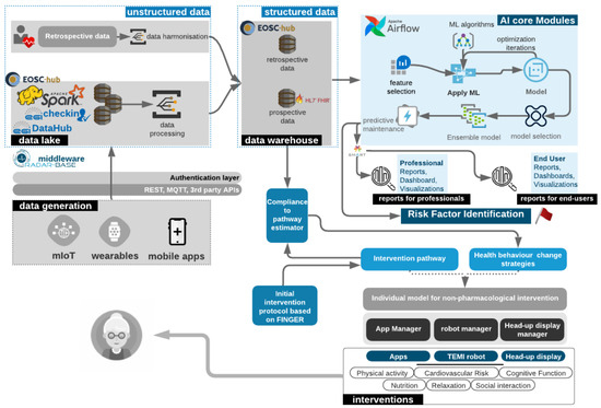 The core modules Data Lake and Data Warehouse comprise big data collection, harmonisation, structuring, and pre-processing in the data lakes and integration into the data warehouse. Data Lake thereby represents a repository of data stored in their raw format. LETHE will employ big data frameworks based on EGI-federated cloud infrastructure (https://www.egi.eu/federation/egi-federated-cloud/, accessed on 10 May 2022) using Apache Hadoop and Spark and EGI/EOSC services for distributed large-scale data management. In phase I of the project, LETHE will resort to and optimise existing data. Clinical relevant data will be structured and saved in the HL7 FHIR standard. This will allow a standardised and secure exchange of data as well as enable additional parties to provide target-group-specific visualisations integrated into third-party electronic health records (EHRs) or hospital systems (for example, using SMART on FHIR (https://docs.smarthealthit.org/, accessed on 10 May 2022). Structured and unstructured data will be hosted in an European open science cloud (EOSC) environment, which ensures secure and protected data storage. The AI core modules form the third major group in LETHE’s architecture, integrating several modules and phases. Feature selection is applied for regression machine learning (ML) modules; otherwise, deep learning models will be used. Model development will apply different approaches, which will be tested and optimised iteratively. Initial models will be based on training with existing data, whereas final models will integrate new features based on digital biomarkers. For the final model selection, the model ensemble will then be analysed in validation trials. The workflow from data retrieval to model optimisation will be orchestrated by Apache Airflow. LETHE will distribute the models over the different trial sites (distributed ML).