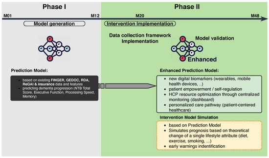 The development of the LETHE prediction model will be comprised of two phases (see Figure 3). Phase I will utilise retrospective data from multiple institutions to train an initial prediction model to predict the possible onset of cognitive decline among older adults at risk of dementia. Retrospective data include features regarding demographics, clinical markers, cognition, health status, functional status, lifestyle, mood, and quality of life. Due to different designs of the involved studies, however, only parameters acquired in the majority of these studies can be used in phase I to provide a sufficiently large data set. In phase II, the baseline prediction model will be extended to include continuous monitoring data about individual behaviours, lifestyle, and digital biomarkers gathered from a variety of wearable technologies. An overview of available data in each phase is shown in Table 1.