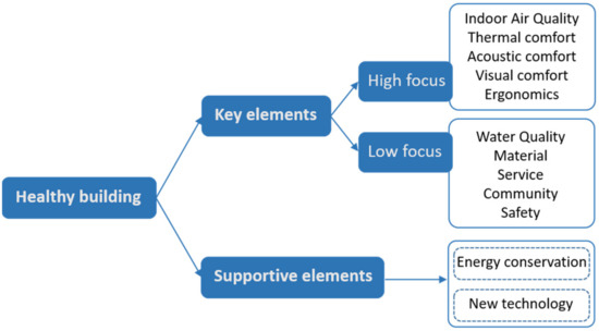 Inasmuch as there is no unified definition for healthy building, on comparing the different definitions, it is worth noting that the key elements involved are about the same. The ideal healthy building addresses physical and psychological components and consists of key elements with high and low focus. Figure 1 summarizes the elements that contribute to healthy building. The key elements with high focus consist of indoor environment quality (IEQ), including thermal comfort; indoor air quality (IAQ); visual comfort; acoustic comfort; and ergonomics [18,19,20,22]. The key elements with low focus include water quality, material, services, security, community, and innovation [18,19,20,22], among others. Additionally, in order to sustain a healthy environment, supportive elements such as an energy conservation system and new technology must be considered, since their integration into the entire building system facilitates and enhances the building operation and maintenance throughout its lifecycle.
