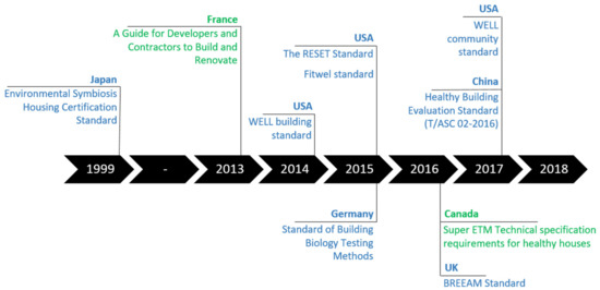 Evolution of healthy building design guidelines (in green) and evaluation standards (in blue).