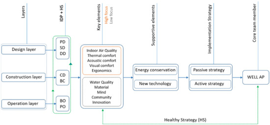 The process of advancing a refocused IDP for healthy building starts by examining the healthy building strategies and technologies during the construction phase. We developed a three-layer model that facilitates the process for healthy building construction activities based on the IDP project delivery method, even though the IDP project delivery method has not been standardized in implementing healthy building construction. To address these issues, additional elements are incorporated into the new IDP framework to highlight the areas where key team members could make a substantial contribution during the design phase by providing direct input to help achieve the goals of healthy building. The proposed IDP framework provides a comprehensive list of healthy construction activities, the goals and procedures at each design phase, and the roles and responsibilities of the team members. For this study, the Well Building Standard system requirements are used as a mean of assessment through design preconditions as it has been proven to be most influential healthy evaluation system with the widest application around the world [22].