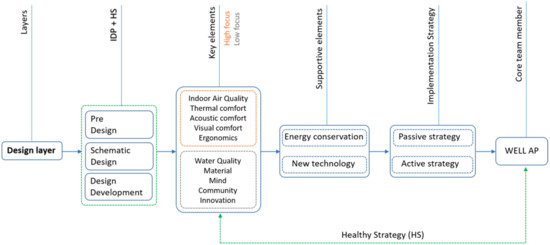 The first layer of the IDP + HS framework (Figure 4), the ‘Design Layer’, focuses on the main achievement of the design team throughout the design process. This layer is divided into three phases: pre-design, schedule design, and design development. It pays maximum attention to the healthy building goals at this stage by providing a breakdown of the content of the built environment, including their precondition requirements, with the assessment methods needed to be implemented. At this stage, key elements are introduced to core team and tasks are assigned by the WELL AP, while constantly updating the project goal for each phase (PD, SD, and DD).