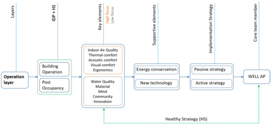 Figure 3 presents the overall iterative process of IDP and HS where the IDP + HS framework consists of three layers, which are the ‘Design Layer as first one’, the second being ‘Construction layer’, and the third as ‘Operation Layer’. The process takes into account the Well Building Standard concepts as key elements which apply to the general building environment (outdoor and indoor) from PD to PO. New technologies are used to support the entire system with passive and active strategies implementation. The WELL AP, as the core member, plays a key role by leading the team and guiding them on how to achieve the expected results. The framework is organized by sets of simultaneous relationships.