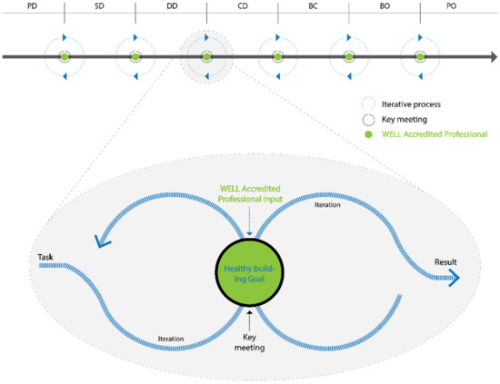 Moreover, the concept of healthy buildings becomes vital if we manage to achieve short and long-term goals by considering the indoor and outdoor environmental quality in the context of one’s health. To successfully achieve healthy building practices, it is evident that a solid team must be composed of the project owner, architects, contractors, engineers, and a WELL AP who will benefit from a comprehensive iterative building framework that includes HS advances through the design, construction, and operation. As part of the effort to construct such a framework, this research posits further advancement of IDP in the context of incorporating HS in the prevailing IDP guidelines with a sequential iterative procedure, hence developing an IDP + HS workflow framework. Figure 7 illustrates the IDP + HS iterative framework, having an embedded WELL-accredited professional (WELL AP) shown in green with a feedback loop from PD to PO in IDP. The IDP + HS iterative framework herein advanced is intended to further aid neophyte and experienced building professionals to reflect about the process of achieving healthy building while optimizing IDP for one’s health invigoration in the construction industry. Additionally, the IDP + HS framework proposed here will support the design team with the lead of the healthy building specialist to produce adequate construction documentation, an area that is often a problem for the construction project. The comprehensive documentation process for healthy construction included in IDP + HS will minimize the need for additional documentation specifically related to healthy building, greatly facilitating the certification process of healthy building in the construction industry. IDP + HS will thus facilitate and strengthen the relationship between IDP and health and the process, documentation, and implementation requirements to achieve a full healthy construction.