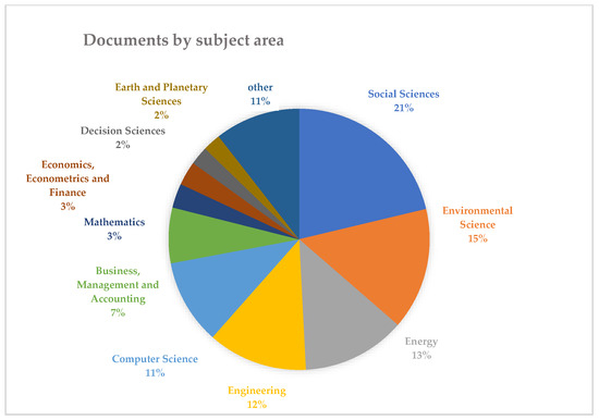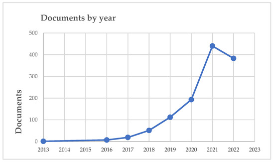 As shown Scheme 1, the number of publications linking “Smart City” and “SDGs” has grown exponentially in recent years. Specifically, we highlight the number of publications expected for 2022; halfway through the year, there is practically the same number of publications as in 2021. In 2021, there were 440 publications; in 2022, halfway through the year, there are 383 publications.
