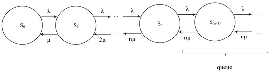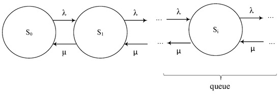 The M/M/1 is a model with exponential inter-arrival times, exponential service times, one server, infinite queueing capacity, and FCFS discipline. A single UAV is considered a server in this model. The graph of the Markov chain of this model is shown in Figure 2 where is the arrival rate and the service rate.