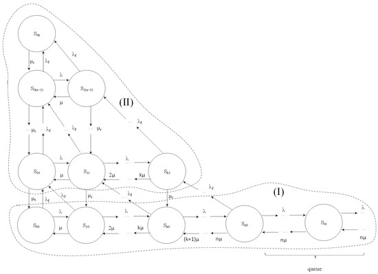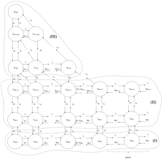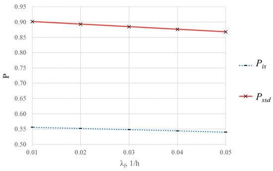 The probability of the successful service delivery (), which is determined by the sum of the probabilities that the system is in an operational state to wait and process applications;