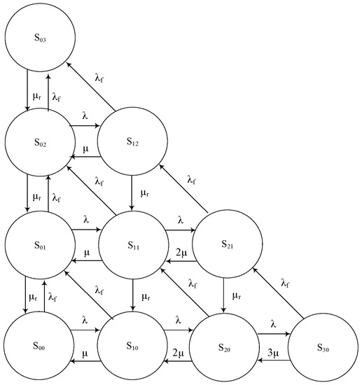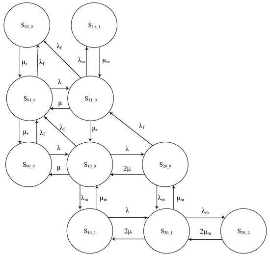However, as was mentioned in Section 2, it can be considered by specifying failure rates considering physical and design faults and attacks on cyber assets. To apply the conservative approach to UAVF dependability assessment, all models presented in Section 3 can be added by a state of the cyber failure, in which transitions from all states exist. Correspondingly, reverse transitions describe recovery processes such as patching and so on. A more accurate assessment can be obtained using multi-fragmental Markov models.
