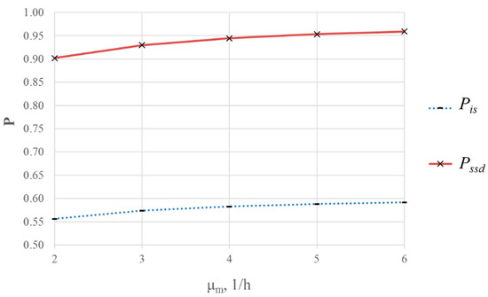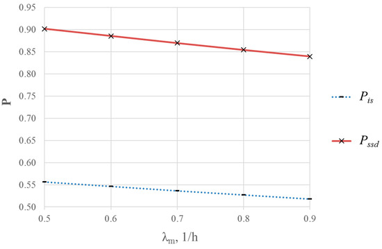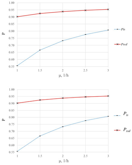 - A large value of the probability of the system idle state indicates inefficient use of the service. To reduce service downtime and provide a high probability of successful service delivery, it is necessary to reduce the number of servers/UAVs while simultaneously improving their characteristics, which will provide the necessary service rate values;