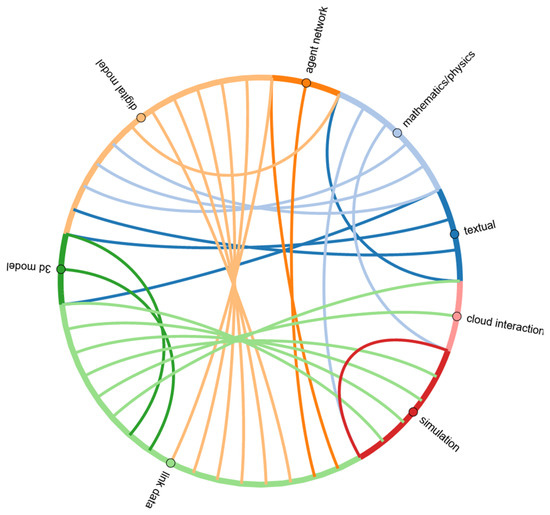 The identified stages and their links are visualised using a chord diagram in Figure 4. As can be seen, the groups “textual and mathematics/physics” are often the starting stage, with no arcs going ending at these nodes. Simulation and cloud interaction were often the end of the research, with no arc leaving these nodes. The stage that was most often used is the link data stage. This is a logical consideration based on the fact that most of the DTs are data-based.