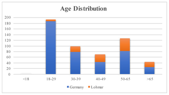 To understand the Shared Mobility Services acceptance and usage behavior in the city of Lohmar, a shared mobility case study was designed as part of the city’s funded Smart City project. With the case study, the municipality wanted to understand how citizens use Shared Mobility Services, what they think about it, and what their mobility behavior is in general. For this purpose, an online survey with scientific question constructs in the form of an extended UTAUT2 model was set up and conducted by the university’s scientific employees (partner in the Smart City project) with the help of the city of Lohmar in the period from December 2021 to March 2022. The online survey was distributed in the city of Lohmar as well as around Germany in order to be able to contextualize the results into a wider context. In Lohmar, the online survey was distributed through channels such as mail, social media, local newspaper, local advertising in the form of leaflets or posters, and events. Nationwide, the online survey was mainly disseminated via online forums, networks, and social media. The aim of these efforts was to achieve the highest possible response rate. Before the survey was posted online, it was tested by three people of different ages to check comprehensibility, and their feedback was integrated. In retrospect, it can be said that the mix of different media in Lohmar made it possible to achieve a very wide range in terms of age, profession, and wealth of experience. In terms of Germany, however, the 18-to-29 age group is somewhat overrepresented, see Figure 1.