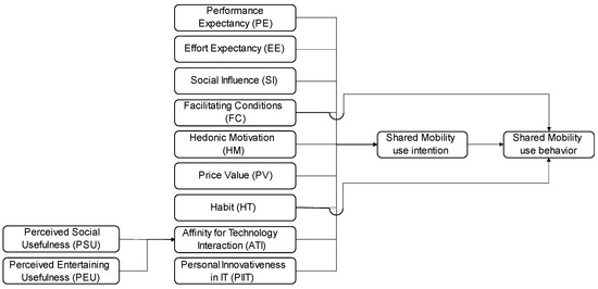 For this case study, the UTAUT2 model was used as a basis because it is an extension of the previously mentioned models. The UTAUT2 consists of seven constructs. The first construct describes the attitude toward using the Shared Mobility Services (Performance Expectancy (PE)), exactly to what extent citizens can gain an advantage when using Shared Mobility Services [35]. The second construct describes the expectancy of Shared Mobility Services usability (Effort Expectancy (EE)). This relates to citizens’ perceptions of the ease of using Shared Mobility Services [38]. The third construct describes the social influence from friends and acquaintances to use Shared Mobility Services (Social Influence (SI)). To what extent do a citizen’s friends influence him or her in the use of Shared Mobility Services [12,39]. The fourth construct describes the prerequisite for using the Shared Mobility Services (Facilitating Conditions (FC)), i.e., does the citizen have the necessary resources to have access to Shared Mobility Services at all [12,37,40]. The fifth construct describes the motivation to use the Shared Mobility Services (Hedonic Motivation (HM)), in other words, the fun factor [39,40]. The sixth construct describes the value for money of the Shared Mobility Services (Price Value (PV)). The more balanced citizens perceive the PV of Shared Mobility Services, the higher the usage [38,41,42]. The seventh construct describes habits of using Shared Mobility Services (Habit (HT)). The more the services become part of everyday life, the greater their use, which leads to their habituation [38]. These constructs all affect the intention to use the Shared Mobility Services (Behavioral Intention (BI)), which in turn the active use of Shared Mobility Services (User Behavior (UB)) in combination with FC and HT [34,38,43]. The UTAUT2 model was extended for this case study by the following four constructs. This construct was added to the case study because the city considers the influences from the media domain to be very high and would like to investigate it more closely [44,45,46,47]. The construct PSU describes the perceived benefit of Shared Mobility Services for one’s own social environment (Perceived Social Usefulness) [48]. The construct PEU describes the fun factor of new digital applications (Perceived Entertaining Usefulness) [49,50]. The constructs PSU and PEU act together on the construct ATI, which describes the technological interaction with new digital applications (Affinity for Technology Interaction). The higher the affinity, the greater the use of Shared Mobility Services [51,52,53,54]. The construct PIIT lastly describes the curiosity about a new digital technology (Personal Innovativeness In IT). The more curious citizens are about Shared Mobility Services, the more they are tested and used [55,56]. The entire model is shown in Figure 2.
