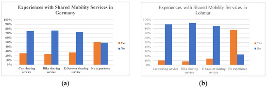 Regarding car sharing services, 25% of all citizens from all over Germany already had initial experience with car sharing compared with the city of Lohmar, where only 11% have experience with car sharing services. Across the country, 24% of all citizens had already experienced bike sharing compared with 8% in Lohmar. E-scooter sharing was used by 28% of all citizens and only 14% of citizens in Lohmar. Overall, 51% of all citizens from Germany indicated that they had not yet had any experience with Shared Mobility Services, and in the city of Lohmar, the figure was 77%. See Figure 3.