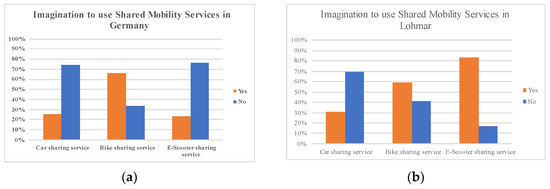 This case study shows that Shared Mobility Services are already known and are already used by some of the citizens or that they have already heard about them. However, Shared Mobility Services are more widespread in large cities than in rural regions, and this case study shows that citizens living in cities have more experience with Shared Mobility Services, where these services are more available. Similar results have been reached by other researchers in the context of electromobility car sharing [30] or during city trips as opposed to rural travel [57]. Shared Mobility Services are a good alternative and a great addition in cities where one is dependent on a vehicle or transportation of any kind [19,21]. The comparison between Germany as a whole and the city of Lohmar help to understand which Shared Mobility Services are particularly well received and helpful as well as where there are still weaknesses. In general, in a direct comparison, all citizens are interested in Shared Mobility Services and would at least like to try them out, be it car, bike, or e-scooter sharing. Especially in Lohmar, 83% of citizens could imagine using e-scooter sharing, although only 31% could imagine using car sharing. This reflects that in Lohmar, citizens own their own cars and that the distances they need to travel are probably far; the need is not yet so high that they need to switch to car sharing. In contrast, 59% could easily see themselves using a bike sharing service. Given the more than 170 km of hiking and biking trails, it can be assumed that citizens will have more use for bicycles to get around, especially electric bike sharing.