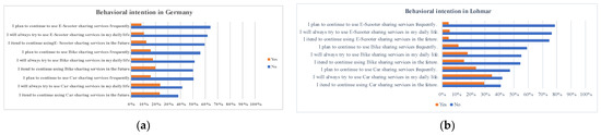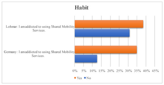 In terms of Habit (HT), among all citizens in Germany, a total of 35% said they were enthusiastic about using Shared Mobility Services, and in Lohmar, 38% of citizens were enthusiastic about the services offered. See Figure 8.