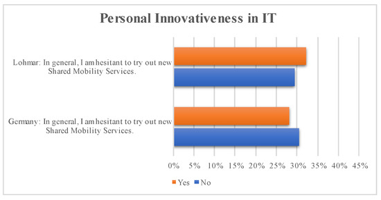 In terms of Personal Innovativeness In IT, 30% of all citizens nationwide indicated that they did not hesitate to try new Shared Mobility Services. In Lohmar, 29% of citizens indicated that they would not hesitate to try new Shared Mobility Services. See Figure 9.