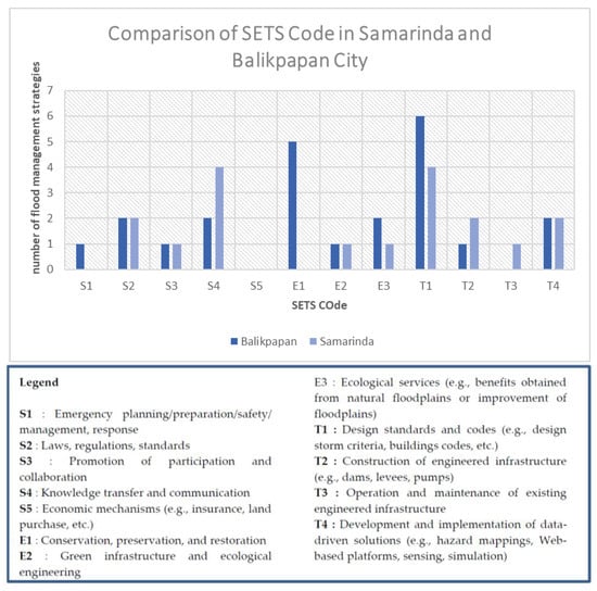 Appendix A shows the documents that meet the research criteria. In this paper, the authors present the key strategies for flooding, based on the government documents that were obtained from online government databases (https://jdih2.samarinda.go.Id (accessed on 20 December 2021). and https://jdih2.balikpapan.go.Id (accessed on 20 December 2021). There were nine documents for Balikpapan City and six documents for Samarinda City regarding flood management strategies. In addition, the authors developed the SETS codebook based on Berbés-Blázquez et al. (2017) and Hamstead et al. (2021) to better comprehend the SETS components of governance strategies [21,63]. Then, the strategies were organized according to the SETS domain, and a SETS code was assigned to each of them. Each strategy was identified in the two cities according to the SETS domain.