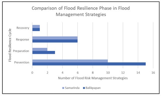 Following the identification of the SETs domain in flood management strategies, this section tries to understand these strategies using the Flood Resilience Cycle developed by Royal Haskoning [41]. The purpose is to find out the position of each city based on an adapted version of the flood resilience circle, which can be applied to enhance the cities’ resilience to flooding. There are four phases of intervention in the Flood Resilience Cycle: prevention, preparation, response, and recovery. The collected data on the flood strategies in the cities of Samarinda and Balikpapan were mapped according to the Flood Resilience Strategy (Appendix B), and their comparison can be seen in Figure 4. The two cities have almost the same approach in dealing with floods. According to the mapping, Samarinda and Balikpapan have different percentages for each resilience cycle. As for the prevention cycle, regulations have been legislated by the Mayors of Samarinda and Balikpapan, as well as the Indonesian Ministry of Public Works (MoPW). The regulations issued by the MoPW, named Zero Delta Q, need to be applied by flood-prone cities as a mandatory program.
