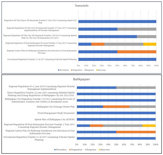 Furthermore, both Samarinda and Balikpapan seem to be more focused on the prevention phase. It is known that every government document always has a prevention strategy. For prevention, Balikpapan has more strategies than Samarinda. However, for the response and recovery phases, these two cities have the same percentage, even though their characteristics are very different. Balikpapan is a coastal city with the majority of its area (85%) being mountainous, and Samarinda has lowlands that are nearly at the same elevation level as the river’s water level.