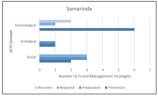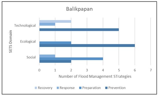 Based on the results derived through the coding, it is inferred that in Balikpapan there are six social domain strategies, eight ecological domain strategies, and nine technological domain strategies. Meanwhile, in Samarinda City, the social domain contains seven strategies, the ecological domain has only two, and the technological domain has nine. The distribution of the SETS domains for each city is presented in Figure 2 Even though both Balikpapan and Samarinda deal with the same problem (floods), their strategic approaches differ. According to Figure 3, Balikpapan follows a rather balanced strategy in the technological and ecological domains. Meanwhile, in Samarinda, the technological domain is more dominant than the social and ecological ones.