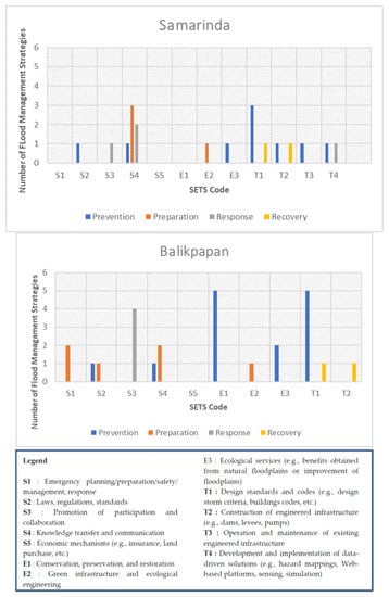 Figure 6 and Figure 7 illustrate a comparison of the Flood Resilience Cycle and SETS in the two selected cities. Although both cities emphasize prevention, the dimensions of SETS that have been implemented differ slightly. In Balikpapan, the prevention phase highlights more significantly the ecological and technological dimensions, whereas in Samarinda, the prevention phase is more focused on regarding the technological and social aspects. Figure 8 shows the distribution of each SETS code in the Flood Resilience Cycles/Phase. Based on the comparison in Figure 8, in Balikpapan, the highest at the prevention phase are the E1 and T1 codes, which stand for “Conservation, preservation, and restoration” and “Design standards and codes (e.g., design storm criteria and building codes).” It is also known that there are similarities in Samarinda, with the T1 code being the highest in the prevention phase, followed by other codes. In the recovery phase, Balikpapan and Samarinda have the same flood management strategies that are T1 and T2. In other words, these two cities only focus on technological domains for flood recovery. Balikpapan has focused on S3, which means promoting participation and collaboration in the response phase, while Samarinda has focused on S4 (knowledge transfer and communication) to deliver flood to the community. However, both Samarinda and Balikpapan have no S5 code (economic mechanism). There is no insurance, especially for disasters, provided by government.