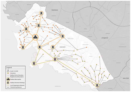 Participants and Volunteering Network of Kadikoy District (map was created by using Survey123 location data of 100 volunteers (via ESRI software) and Volunteer House data [56]).