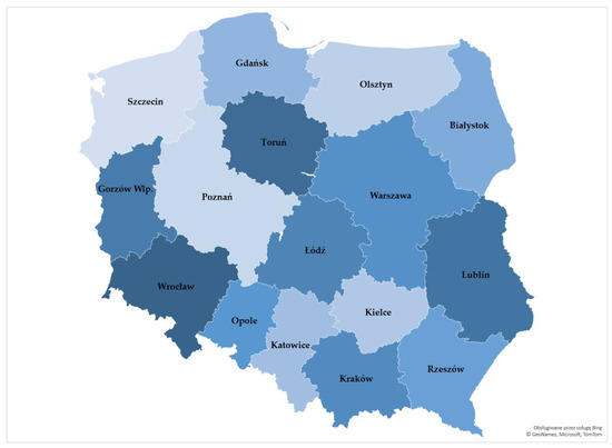 - Cost efficiency in 2021 in PLN/ton (destimulant)—the higher the cost of waste collection, the lower the efficiency of the public sphere (a parameter important for assessing the economy of the city government);