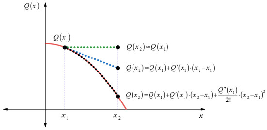 Taylor theorem relies on the fact that the true function value would be equal to the Taylor polynomial approximation plus some reminder which also can be considered as the error between the actual function value and the Taylor polynomial. However, truncating after k-th order with zero error we implicitly admit that the origin function is of the k-th order. Therefore, if we obtain the exact value by considering the k-th order truncation with zero error that means the origin function is of k-th degree, because the (k + 1)-th order is zero. For example, truncating after the 2nd order derivative with zero error means the origin function is quadratic as depicted in Figure 1.