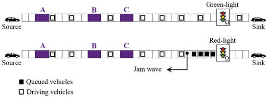 Schematic diagram describes the formation of travelling jam moves towards three different locations A, B, and C.