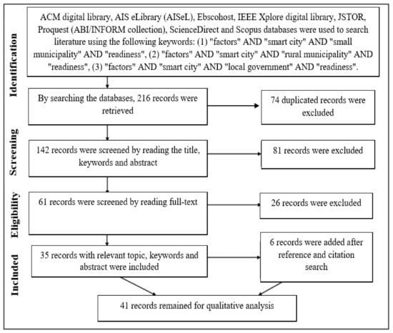 In this research, the researchers followed a systematic literature review approach to identify and review the literature pertinent to those key factors deemed critical in assessing small and rural municipalities’ readiness for smart city implementation [41,42].