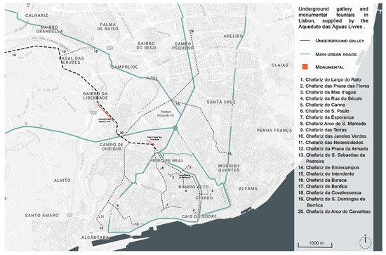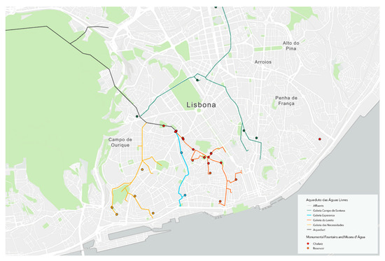 The empirical research took place in the city of Lisbon, where a complex network of above-underground asset, concerning the drinking water system, is nested within the urban environment, making the validation compelling and generalizable. The old water supply system of the city of Lisbon, Aqueduto das Águas Livres, represents a case with enormous potential to be exploited, with several elements of historical and geographical continuity connecting different areas of the city. Citizens and tourists alike are avid in relation to underground heritage, considering the strong demand for visits to the Roman galleries of Baixa Lisbon [9]. Many elements have already disappeared from the city, but they still exist in photographs, engravings, cartographies, and descriptions by authors of the past [10].