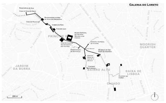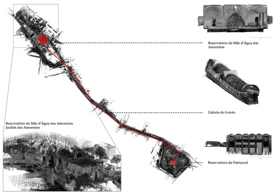 Considering the extent of the water system, this study focused on the Principe Real area, in particular, on the Galeria do Loreto and the two reservoirs, the Reservatório da Patriarcal and the Reservatório da Mãe d’Água das Amoreiras, which, together with the different access points to the underground environment, represent points of connection with the urban environment above (Figure 3). The Galeria do Loreto comes from the Reservatório da Mãe d’Água. It has a total length of 2835 m, including its branches. At present, it is the only gallery that can be visited, with a 1.5 km underground section that ends at the Reservatório da Patriarcal, in the Jardim do Príncipe Real [35,36].
