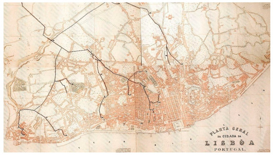 Concerning the availability of sources, the data were partly acquired using datasets available in the GIS Lisboa platform of the Câmara Municipal Lisboa (City Council) and partly from the analysis of historical raster cartography (Figure 4). In detail, datasets were downloaded from the GIS Lisboa concerning the Architecture of Water and the National Museums, from which a selection was then made only for the parts to be used for the purposes of the study [39]. Through the Centre for Historical and Technical Documentation (CDHT) of EPAL [40], it was possible to access online some digitized plans of Lisbon from the second half of the 19th century, including plans of the water distribution network in the city, the underground gallery, and the two reservoirs.
