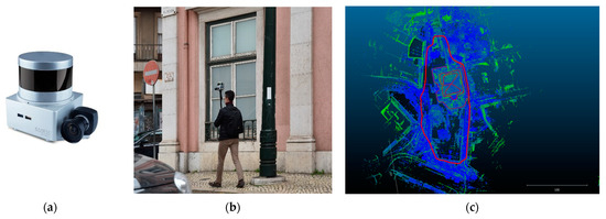 (a) The MMS Kaarta Stencil 2–16; (b) An operator using the MMS detecting the urban environment; (c) Top view of the 3D point cloud and closed loop trajectories (red lines) made with the MMS.