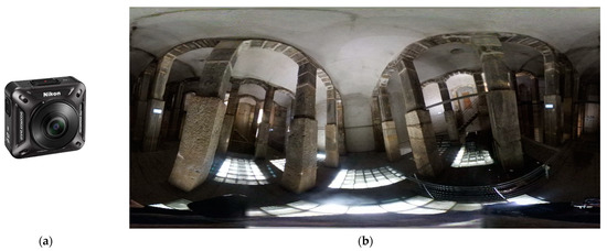 (a) Nikon KeyMission 360; (b) Image captured with spherical camera.