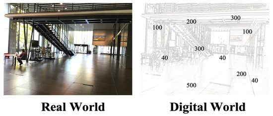 In a digital twin, various things in the real world (left-hand side of Figure 1) must be converted into digital shadows in the virtual world (right-hand side of the figure), where the numbers represent the ID of each digital shadow in the virtual world, and the ID is used to access detailed information about the digital shadow. One classic example of current approaches is the Virtual Helsinki Project [21]. In the Virtual Helsinki Project, an exact replica of Helsinki is digitally constructed in the virtual world. The digitized replica consists of various virtual objects, such as virtual buildings, virtual streets, and virtual shops, modeled from acquired data. Virtual objects can be used to visualize a virtual world that represents a digitized replica that is a mirror world of the real world. In addition, digitized replicas can be used to predict various aspects of the real world, according to the acquired data. This approach provides an infrastructure that provides promising opportunities for developing innovative services in the future. Digitized replicas within the virtual world are also used to manage invisible information that exists within the virtual world.