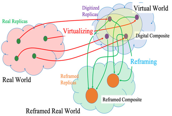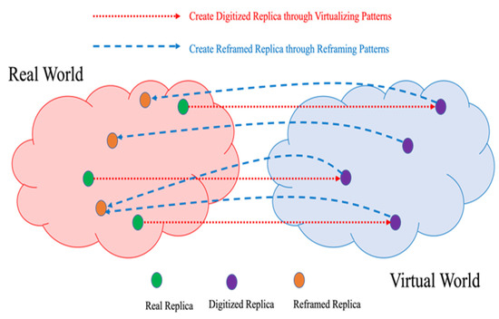 The opportunity analysis of the V/R twin model presented above reveals the roles of virtualizing- and reframing-patterns. Agential realism, as discussed in Section 3, asserts that the world is an entanglement of the social and the material. By abstracting the real world, the virtualizing-patterns untangle its entanglements into multiple digitized replicas, through abstracting the real world. In other words, by analyzing and understanding the entanglements of the real world, the operators of the virtualizing patterns can reveal unexplored opportunities for building advanced real-world services. From the perspective of agential realism, we may say that there are no real replicas, because the reality consists of the real world’s entanglement, and so the replicas are already virtualized from the entanglement. Therefore, there are many ways to investigate digitized replicas for reframing them, coming from the many possibilities of agential cuts.