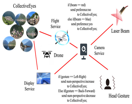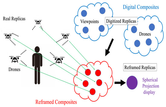 Finally, we show a use-case of the in situ programmable-composite that is created using the design-fiction method [59,60]. Figure 7 shows a conceptual diagram of an in situ programmable-composite called a multi-viewpoint aerial projection. It displays the multiple viewpoints stored in CollectiveEyes, by projecting the viewpoints through multiple drones. Each drone projects one viewpoint in the air. Multiple drones are arranged in a spherical shape around a user, and display various viewpoints in the 360-degree space around the user. The user holds a laser beam that emits blue and red in his or her hand, and uses it to express his or her preference for the viewpoint displayed by each drone. When the drone is irradiated with a blue laser, the viewpoint is preferred, but when it is red, the viewpoint is not preferred. The displayed viewpoint is dynamically changed by the user, who presents a preference for each displayed viewpoint. In addition, the distance between the user and the drone is adjusted by the user’s head gesture. As the distance between the user and the drone increases by shaking the head left and right, the diameter of the spherical projection displayed around the user also increases. In this case, the number of drones automatically increases, and the number of viewpoints displayed also increases.