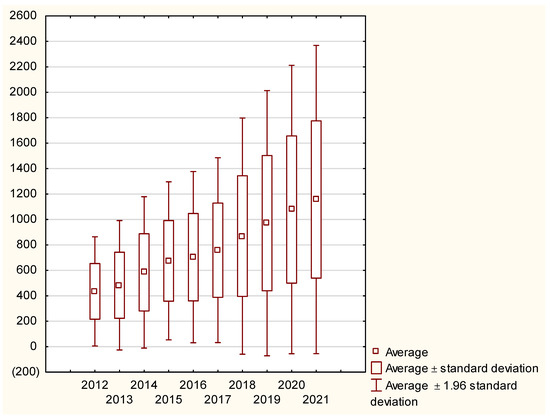 In Table 3 there is and juxtaposition of basic descriptive statistics for the variability of bike road lengths in the following years from 2012 to 2021. In the table, there are data about the average value, median, minimum value, maximum value and standard deviation. Figure 1 is a box plot to illustrate statistical variability. We can observe that the standard deviation is increasing year by year because of the increasing total amount of bicycle road lengths between 2012–2021. In the year 2012 the average bicycle length was 434,7 km per province in 2021 the average increased to 1159,9 km. The total amount of bicycle road length between 2012–2021 was 266%.