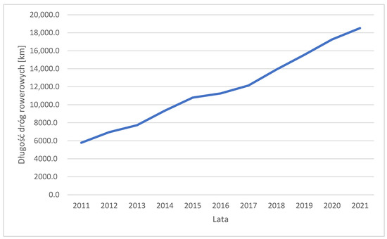 Figure 2 shows the number of bicycle paths in Poland from 2012 to 2021. The figure shows that in the last decade, there has been a linear growth rate in the number of kilometres of bicycle paths in Poland. Only in the years 2015–2017, a slight slowdown in the trend can be observed, but after 2017 the growth of the length of bicycle paths in Poland returned to its earlier level. World experience [39] proves that the construction of an advanced system of bicycle roads is the basis for promoting the idea of using bicycle transportation in the field of smart mobility.