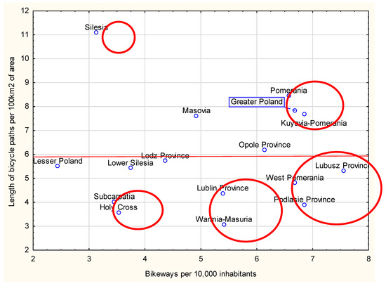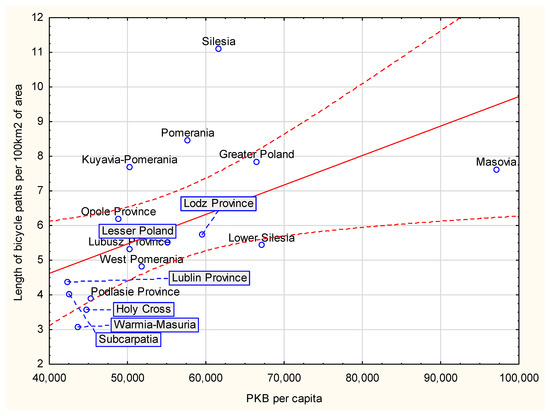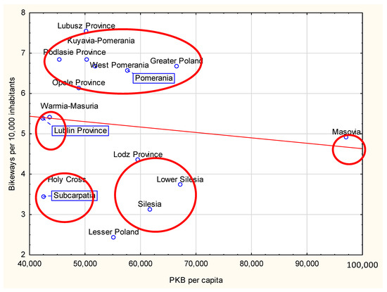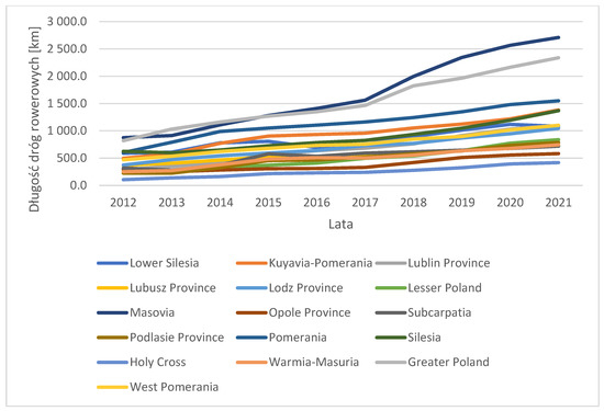 An analysis of trends over the studied 10 years in Poland’s provinces allows us to conclude that during the studied period the increase in bicycle roads occurs relatively evenly, while one can see deepening differences between individual provinces. Those provinces that showed the highest values of the indicator of the length of bicycle paths per 10,000 inhabitants in 2012 show it in 2021, similarly, there is not much change in the case of provinces in the last places.