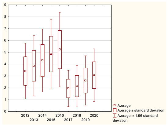 In Table 6 there is and juxtaposition of basic descriptive statistics for the variability of bicycle road lengths per 10,000 inhabitants in the following years from 2012 to 2021. In the table, there are data about the average value, median, minimum value, maximum value and standard deviation. In Figure 4 there is a box-plot for the variability of bicycle road lengths per 1000 inhabitants. We can observe that the lowest standard deviation was in the years 2016–2017—in those years the differences between polish provinces were lowest. The highest value of standard deviation in the case of bike road lengths per 1000 inhabitants was in the years 2013–2014 where the differences between the provinces were highest.