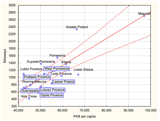 - H2. The length of bicycle paths per 10,000 inhabitants in a given province is correlated with the GDP per capita in that province.