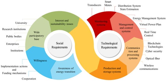 However, energy communities also provide the opportunity for knowledge development in various fields, such as technology [91,92]. The activities that ensure their operation are high-tech and range from cybersecurity to communication systems to artificial intelligence to develop models that can optimise self-consumption performances [93]. Thus, it can be said that the requirements to realise an energy community are not only social in nature but also involve the sphere of technology that operates to support the activities. An infographic depicting the requirements in social and technological terms is provided in Figure 3: social will and commitment to information dissemination by local government, as well as a proper mechanism of funding RE projects, are fundamental. In terms of technology, network measurement and control systems are indispensable nowadays.