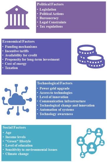 The technologies are already available, although many of them can be costly. However, they will play a leading role in the future, particularly in the automation of the community smart grid. The technological level that the community adopts will determine the level of direct involvement of the actors and the costs associated with investment and maintenance. But, thanks to the system’s operational and control algorithms, the users might perceive higher quality, positively impacting the REC project acceptance. The factors that determine and influence the success of REC initiatives are multiple and transversal. Figure 4 shows the factors that can help to analyse the political, economic, socio-cultural, and technological changes in the business environment (PEST analysis, [94]) for identifying critical influencing factors. In this case, the analysis is not limited to external factors.