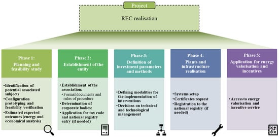 The framework to support REC creation is not designed to provide a minute level of detail for implementation but rather to identify the main points to consider during this process. For its formulation, it is essential to define the project’s phases that enable the REC’s creation and full operation. As illustrated in Figure 9, five stages have been identified. Each stage includes multiple activities.