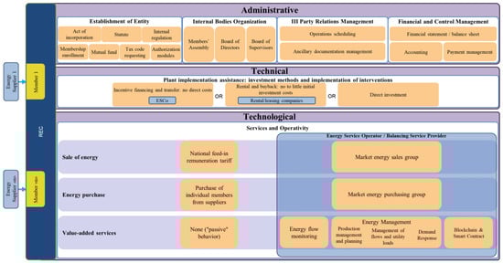It was decided to adopt a decomposition approach to address a complex system to focus more on different areas. Therefore, three scopes were identified: administrative, technical, and technological. The last two were mentioned earlier, and their combination forms the Tactical area. The three scopes should not be considered watertight compartments. The interfaces between them are represented by the set of rules, procedures, and methodologies adopted by the community. The actors that take part in the life and activities of the community can still be identified: members, internal bodies, and third-party entities. External subjects, such as service providers, are reported in a semi-transparent blue box. A category of third-party subjects is the energy supplier reported in the figure to emphasise that, per regulation, members must be guaranteed to pertain to their preferred energy provider.