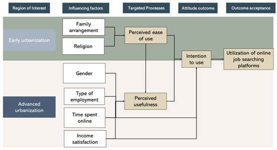Our empirical results, incorporated into the TAM model [36], suggested that policies needed to be implemented to achieve positive results in encouraging the older population’s utilization of online job search platforms, varied from one location to another, depending on a wide-ranging list of factors. We recommend that, for areas with high levels of urbanization and development, urban planners need to focus on the perceived usefulness of these platforms and take into account gender, types of employment, familiarity with the Internet, and income factors. On the other hand, those in an area with early urbanization and less progress need to concentrate on the influence of religion and family arrangements to enhance the perceived ease of use. The interactions between these factors and the targeted processes and outcomes are not exclusive (Figure 1). Both processes need to be met in order to achieve the desired outcome of encouraging the older urban poor to want to use the Internet when they look for suitable employment on different platforms.
