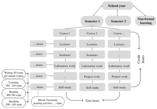 There are huge differences in Credit hours from one curriculum to the other. These differences are a result of the national education standards, the education system, knowledge domains, the education level, school year length, the courses in the curriculum, etc. In the common traditional education model, the school year has two semesters; however, the number of weeks within each semester can vary. For example, the school year of the Technical university of Sofia has two semesters, each one 13 weeks, the school year of the technology school “Electronic Systems” has two semesters, and each one has 18 weeks. Each course within a semester of a curriculum depends on the knowledge domain and includes predefined hours for teaching-learning—lectures, seminars, laboratory work, project works, etc. Courses credit hours and time required also vary in such a curriculum time framework. In order to achieve the learning objectives, the lecturers and teachers must also take into account the time regarding the learner’s ability to perform different learning activities (Figure 1). For example, a normal rate for learning is 100–200 words per minute (wpm), and for comprehension, it is 200–400 wpm. The speed of reading, when it is done normally, is usually at a rate of around 400–700 wpm [5]. Learners’ abilities to perform different learning activities, such as analyzing, discussing, observing, presenting, summarizing, etc., according to Bloom’s taxonomy [6], also vary regarding the length of time. This study tries to answer the research question “What KPIs for learning process analyses should be used based on the data available from LMS, and out of LMS, in support of better time efficiency?”.
